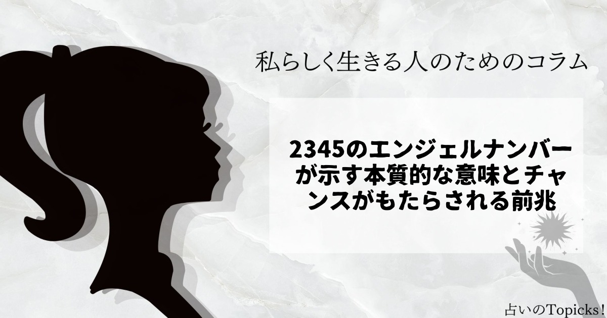 毎日の生活の中でふと目にする数字には、天使たちからのスピリチュアルなメッセージが込められていることがあります。その中でも「2345」は、段階的な成長や幸運な変化を示す特別なサインです。本記事では、「2345」が持つ本質的な意味から、それがもたらす前兆、恋愛・金運・ツインレイとの関係、そして実際にこの数字を見たときにどう行動すべきかまで、具体的で実用的な視点で徹底解説します。2345の神秘を深く知ることで、あなたの人生に幸運と変化を呼び込みましょう。