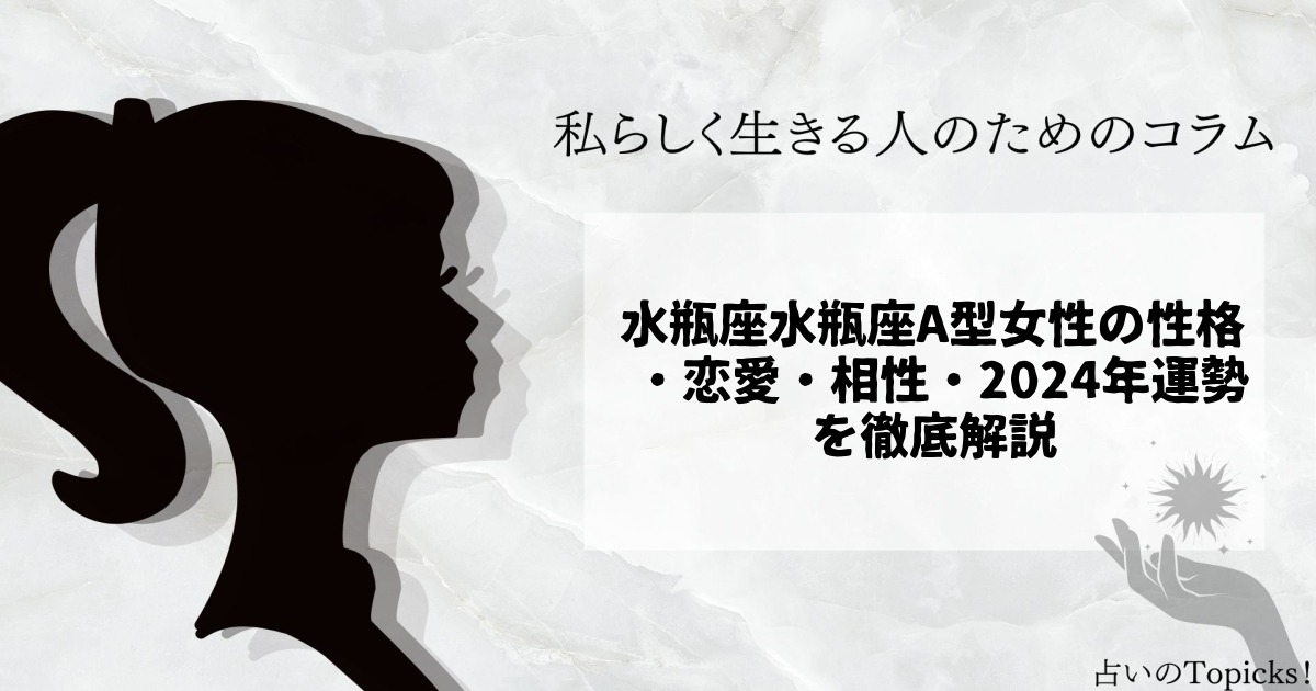 個性豊かで知的、そして公平な判断力を持つことで知られる「水瓶座A型女性」。本記事では、水瓶座A型女性の基本的な性格から恋愛傾向、適職や人生のアドバイス、2024年の運勢まで、検索上位の情報を徹底網羅してお届けします。あなた自身や身近な水瓶座A型... -